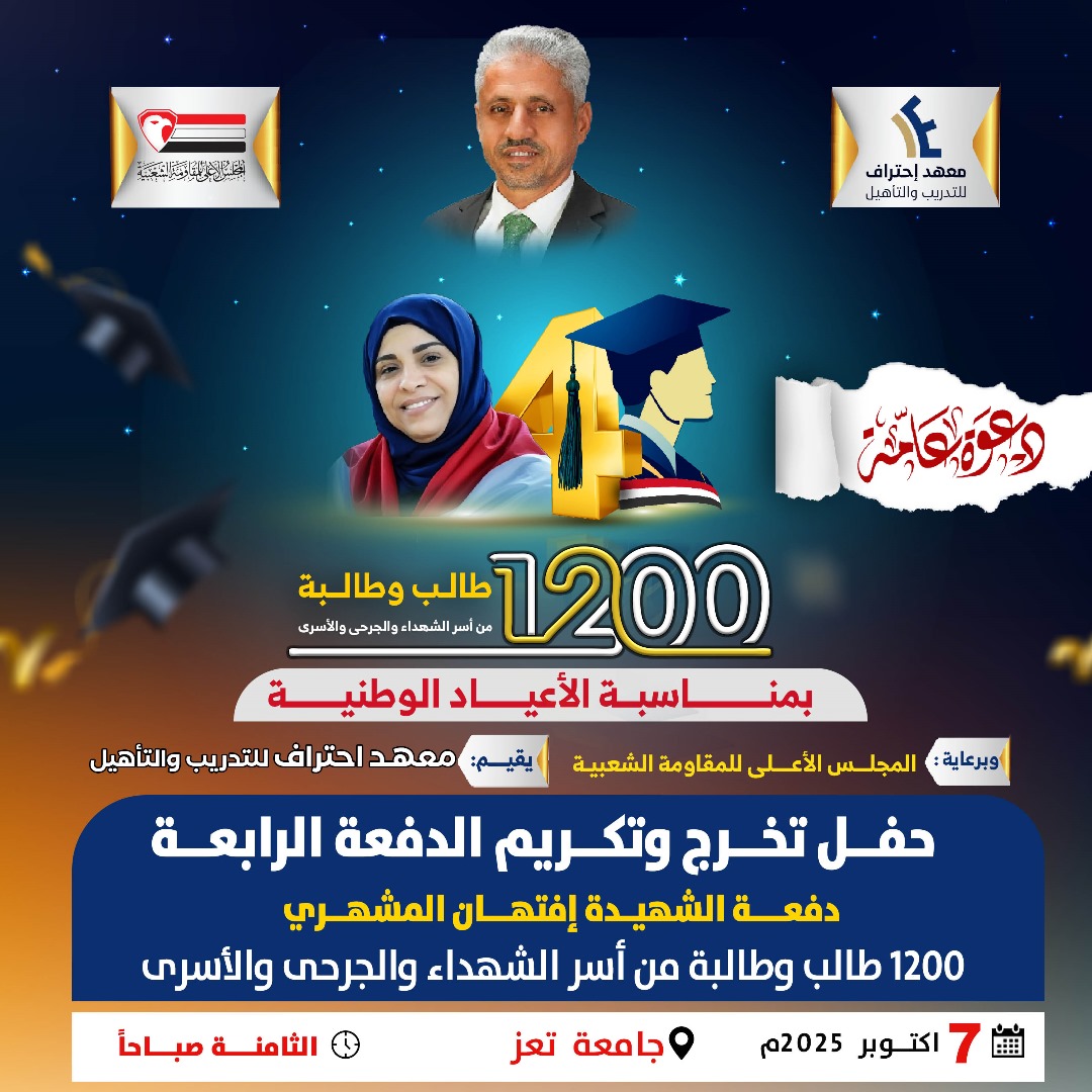 دعوة لحضور الحفل الجماهيري الكبير لتخرج الدفعة الرابعة، دفعة الشـهيدة افتهان المشهري يوم الثلاثاء 7 أكتوبر 2025م